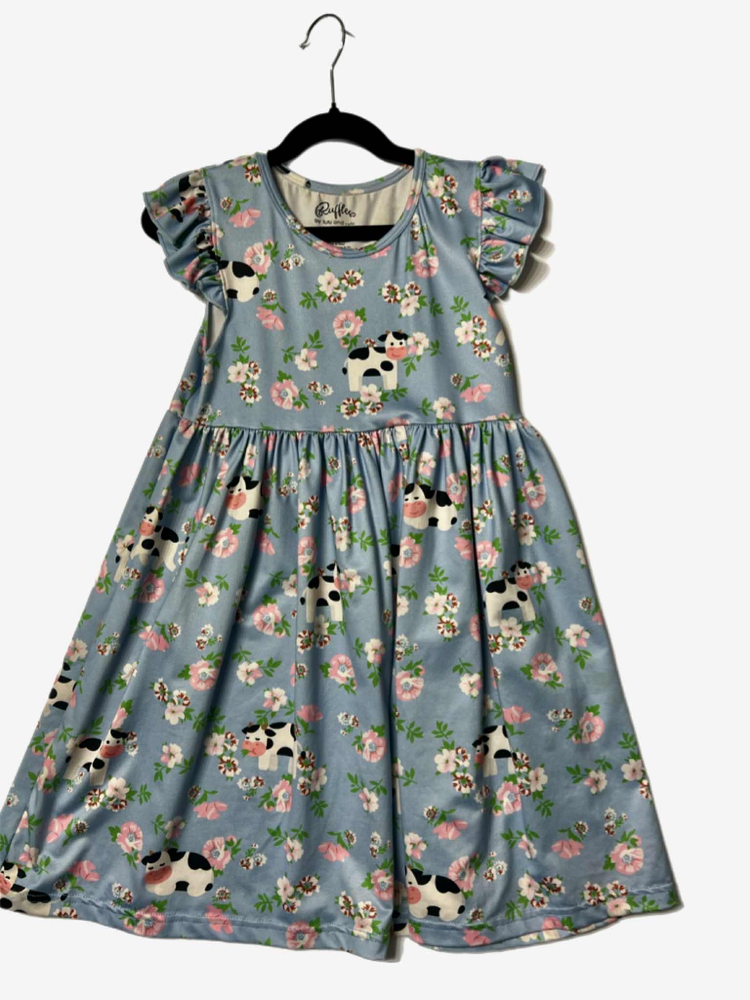 Girls Floral & Cow Print Ruffle Dress